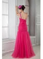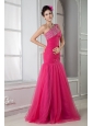 Terrific maybe the word that comes to your mind when you see this dress. It features a irregular one shoulder neckline with colorful beading encrusted. The bodice is full of pleating which continues to the hip as well as the back. Soft tulle skirt flows in clear line to the floor. And zipper up on one side secures the dress in place. Unique design, so perfect!