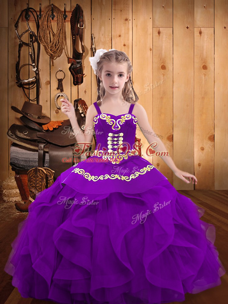 Home >  Special Occasion Dresses >  Beautiful Kids Pageant Dresses > Latest Floor Length Lace Up High School Pageant Dress Eggplant Purple for Party and Sweet 16 and Quinceanera and Wedding Party with Embroidery and Ruffles