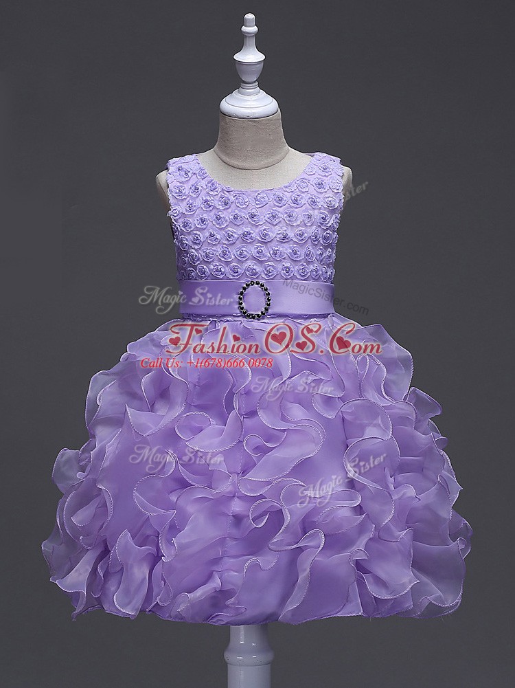 Latest Knee Length Lavender Kids Pageant Dress Organza Sleeveless Ruffles and Belt