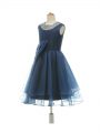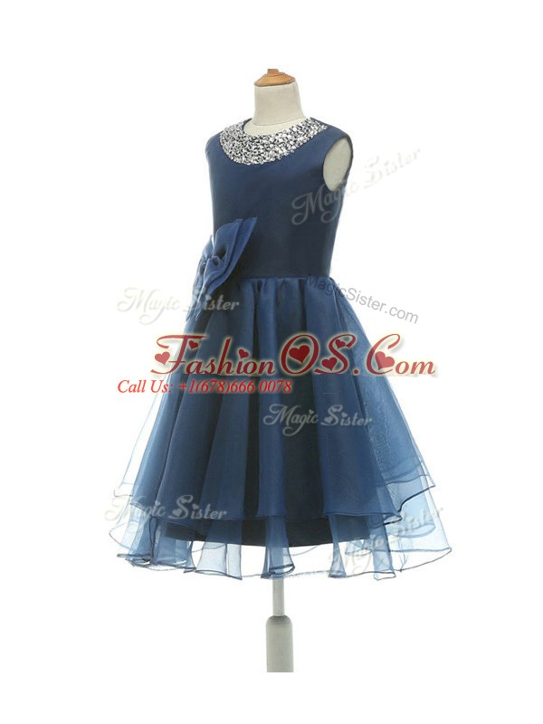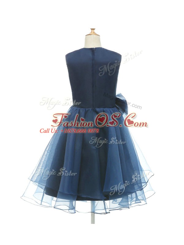 Latest Navy Blue Sleeveless Knee Length Beading and Bowknot Zipper Kids Pageant Dress