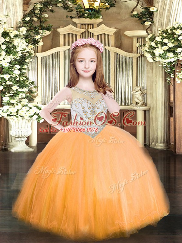 Latest Orange Tulle Zipper Scoop Sleeveless Floor Length Little Girls Pageant Dress Beading