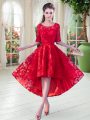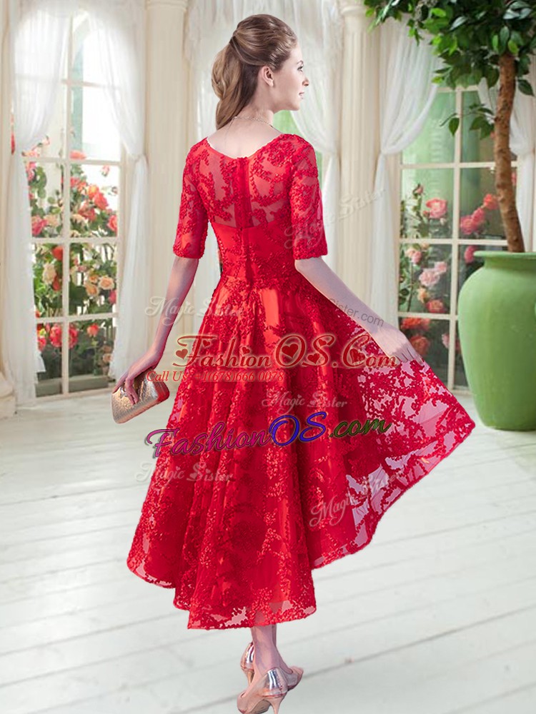 Latest Scoop Half Sleeves Zipper Lace Prom Dresses in Red