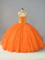 Latest Sleeveless Floor Length Beading Lace Up Quince Ball Gowns with Orange