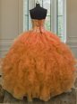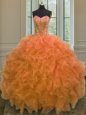 Latest Sweetheart Sleeveless Quince Ball Gowns Floor Length Beading and Ruffles Orange Organza