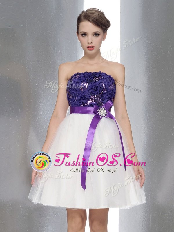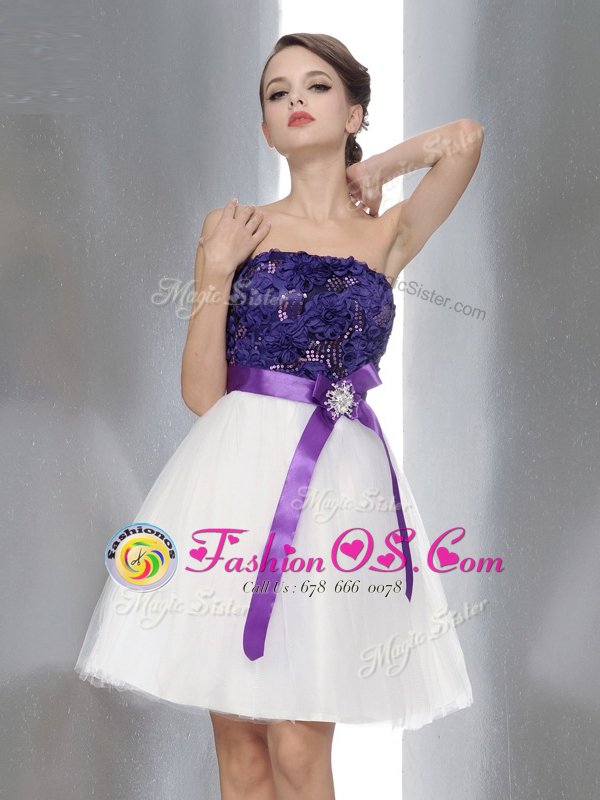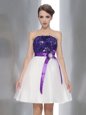 Latest White And Purple Chiffon Zipper Cocktail Dresses Sleeveless Knee Length Beading and Sashes|ribbons