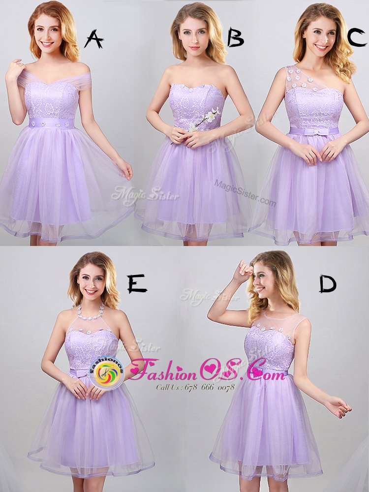 Lavender A-line Tulle Sweetheart Sleeveless Beading Knee Length Lace Up Bridesmaid Dress