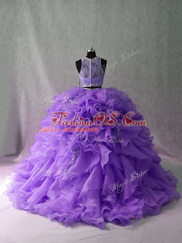 Lavender Ball Gowns Beading and Ruffles Ball Gown Prom Dress Zipper Organza and Sequined Sleeveless Floor Length