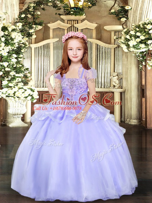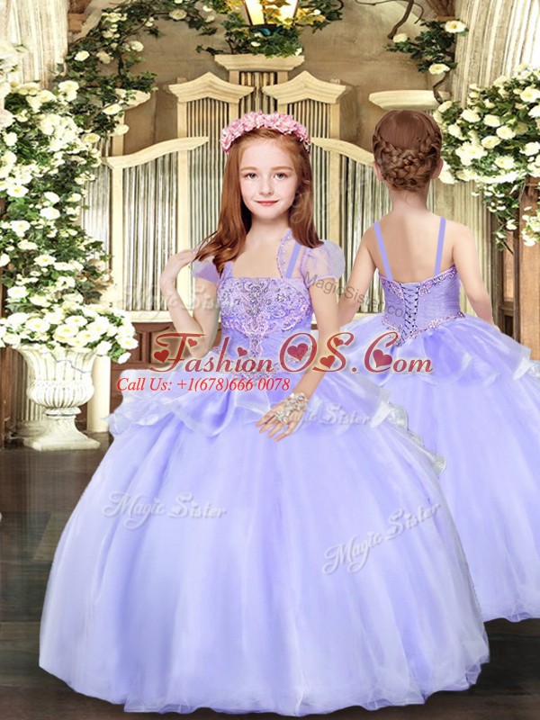 Lavender Ball Gowns Organza Straps Sleeveless Beading Floor Length Lace Up Kids Formal Wear