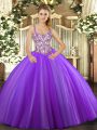 Lavender Ball Gowns Straps Sleeveless Tulle Floor Length Lace Up Beading and Appliques 15th Birthday Dress