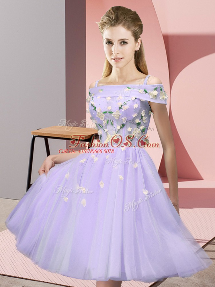 Home >  Special Occasion Dresses >  Discount Dama Dresses > Lavender Empire Off The Shoulder Short Sleeves Tulle Knee Length Lace Up Appliques Dama Dress for Quinceanera