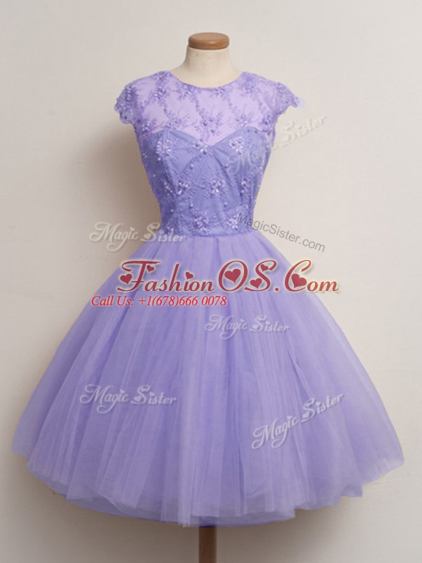 Lavender Lace Up Scoop Lace Bridesmaids Dress Tulle Cap Sleeves