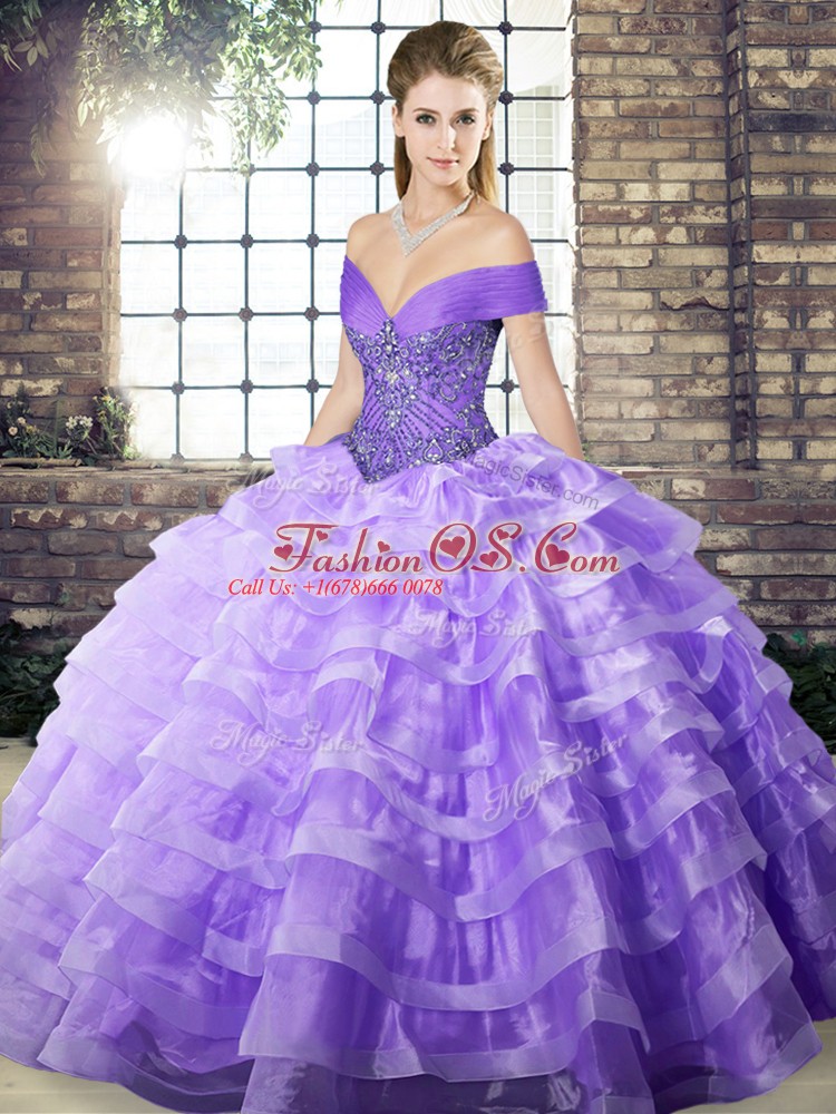 Lavender Quinceanera Gown Organza Brush Train Sleeveless Beading and Ruffled Layers