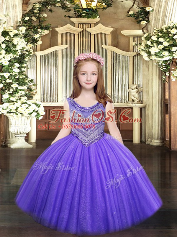 Lavender Sleeveless Floor Length Beading Lace Up Pageant Gowns For Girls