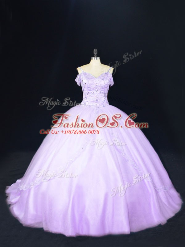 Lavender Sleeveless Tulle Court Train Lace Up Ball Gown Prom Dress for Sweet 16 and Quinceanera