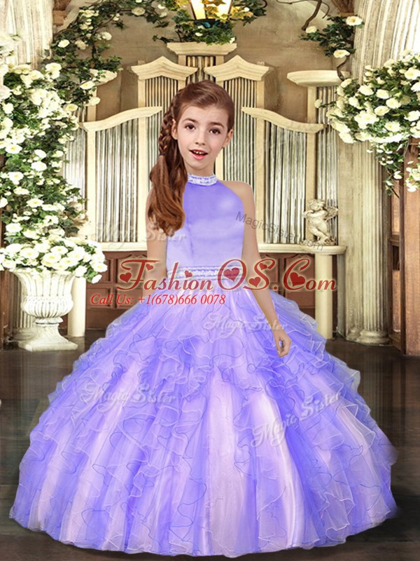 Home >  Special Occasion Dresses >  Lovely Little Girl Pageant Dresses > Lavender Tulle Backless High-neck Sleeveless Floor Length Kids Formal Wear Beading and Ruffles