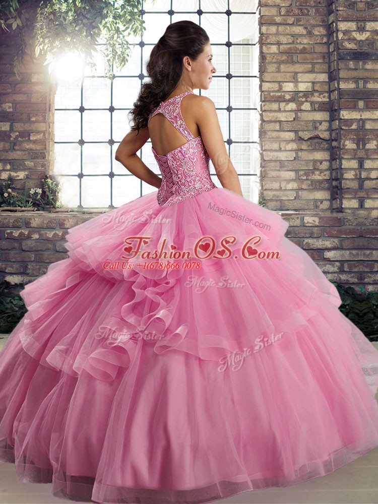 Lavender Tulle Lace Up Quince Ball Gowns Sleeveless Floor Length Lace and Embroidery and Ruffles