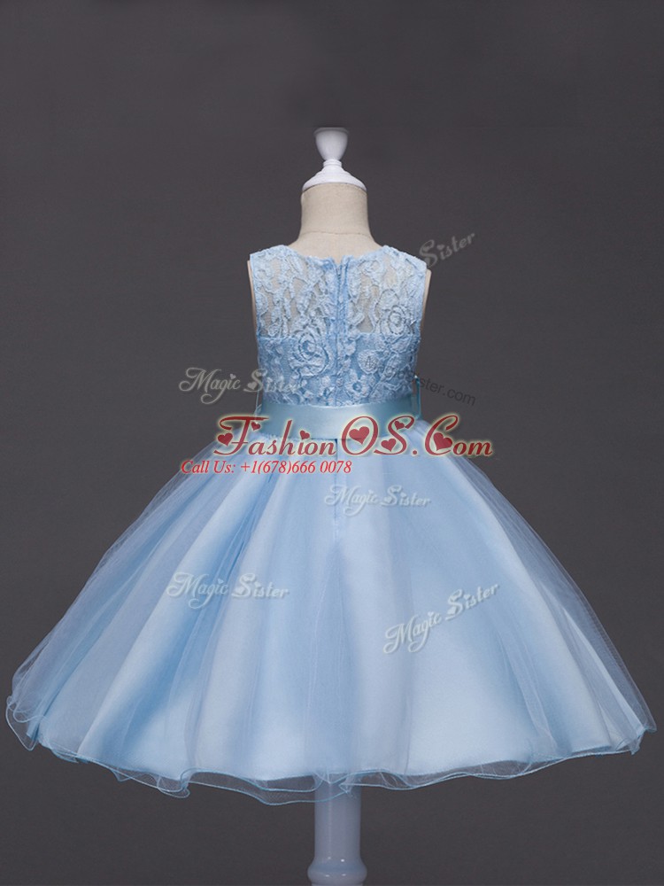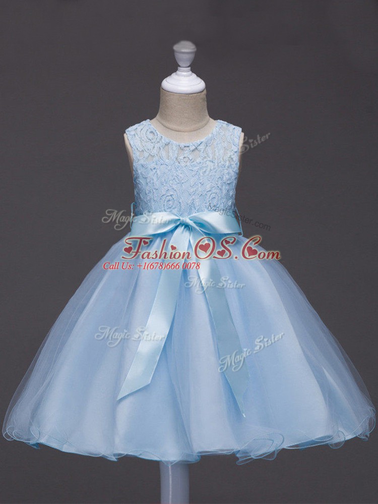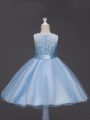 Light Blue Ball Gowns Lace and Belt Little Girls Pageant Gowns Zipper Tulle Sleeveless Knee Length