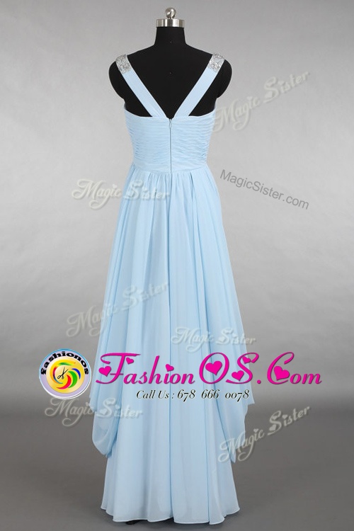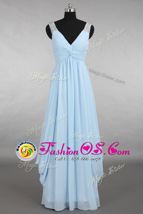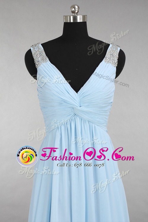 Light Blue Chiffon Zipper V-neck Sleeveless Floor Length Beading