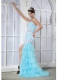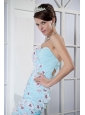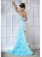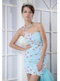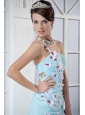 Home >  Prom Dresses >  Short Prom Dresses > Light Blue Column One Shoulder Mini-length Elastic Woven Satin and Chiffon Appliques Prom Dress