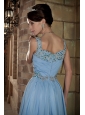 This elegant light blue prom features two straps encrusted with beadings, a ruched bodice and a special neckline accented with a lot of beadings. The waist is empasized by beadings which locate above the waist and shows a inverted V. The flowy skirt moves graciously with you when you walk, gently sweeping the floor in an old south style. A zipper up closure in the back secures the dress in place.