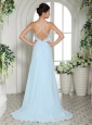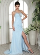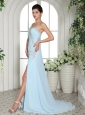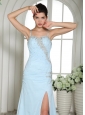 Light Blue High Slit Spaghetti Straps Beaded Over Bodice Prom Dress With Brush Train In Canton