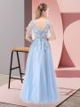 Home >  Prom Dresses >  Modest Prom Dresses > Light Blue Lace Up Scoop Appliques Homecoming Dress Tulle Short Sleeves