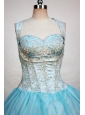 The bodice features a criss-cross strap sweetheart neckline completely encrusted by the crystals. The light blue skirt accented by the appliques will be sure to turn heads. A lace up back completes the look.