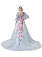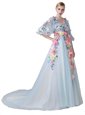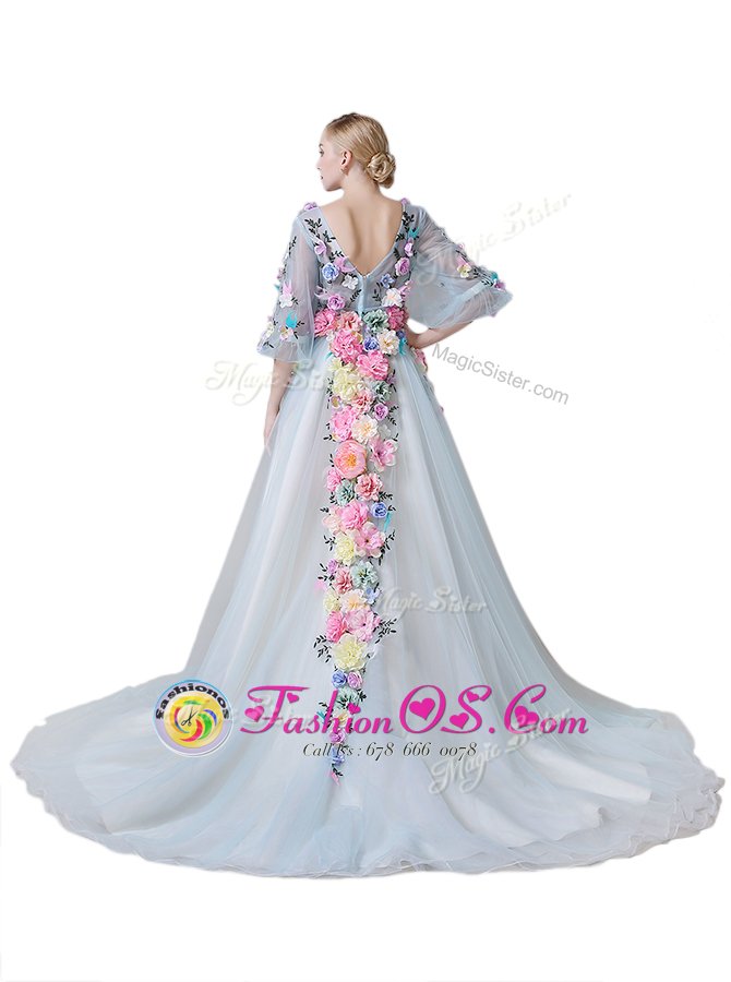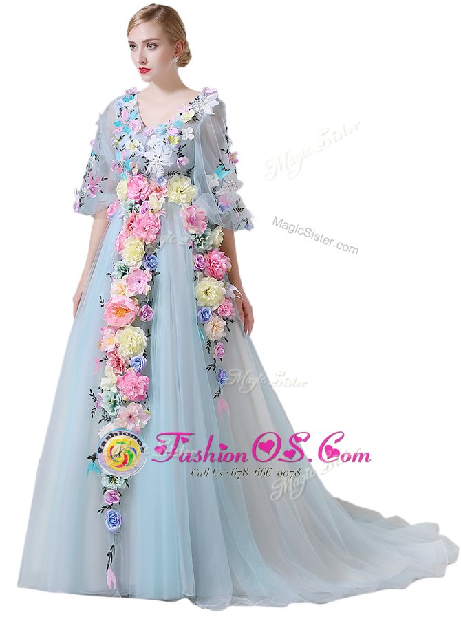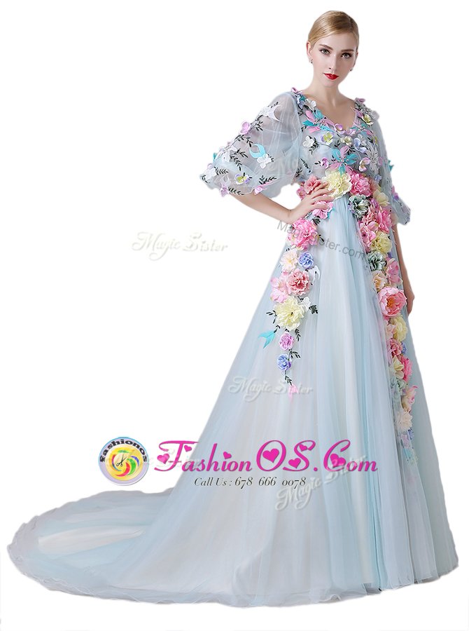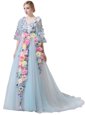 Home >  Prom Dresses >  Perfect Prom Dresses > Light Blue Tulle Zipper Evening Dress Half Sleeves With Train Court Train Hand Made Flower