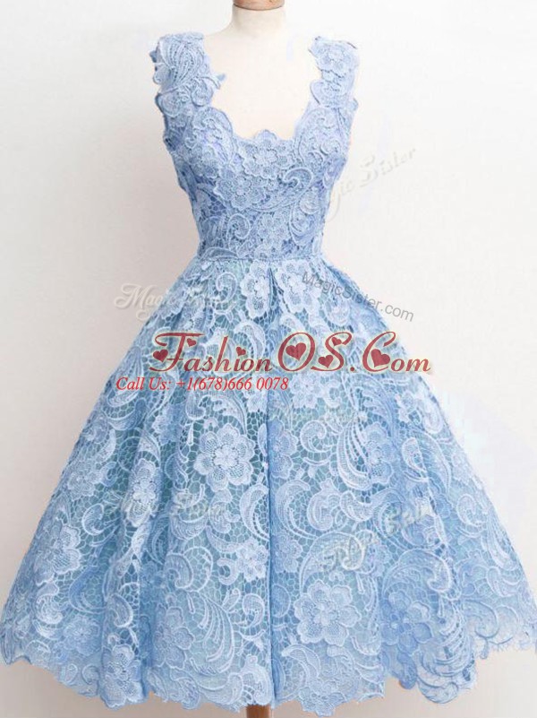 Light Blue Zipper Bridesmaid Dress Lace Sleeveless Knee Length