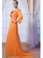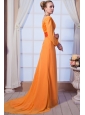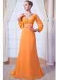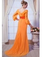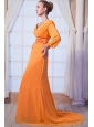 Elegant draping on the neckline and sparkling beading on the cuffs give this long sleeve orange dress an elegant style for your next special occasion. It featuring a pleated bodice and shining beads accent on the wide waistband. The floor-length skirt is so smooth and elegant that extends into a lovely brush train in the back. The open back can show your beauty and a zipper up completes this fabulous design!