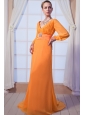 Home >  Special Occasion Dresses >  Mother of the Bride Dresses > Light Orange Empire V-neck Brush Train Chiffon Beading and Ruch Mother Of The Bride Dress