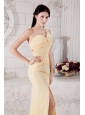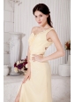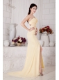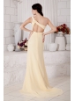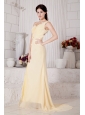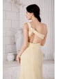 Light Yellow Empire One Shoulder Hand Made Flowers Prom / Evening Dress Brush Train Chiffon