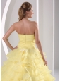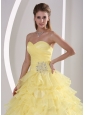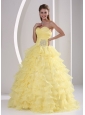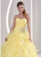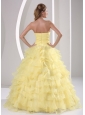 Home >  Quinceanera Dresses >  Unique Quinceanera Dresses > Light Yellow Ruffles Sweetheart Appliques and Ruch Quinceaners Gowns For Military Ball