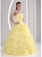 Light Yellow Ruffles Sweetheart Appliques and Ruch Quinceaners Gowns For Military Ball