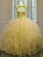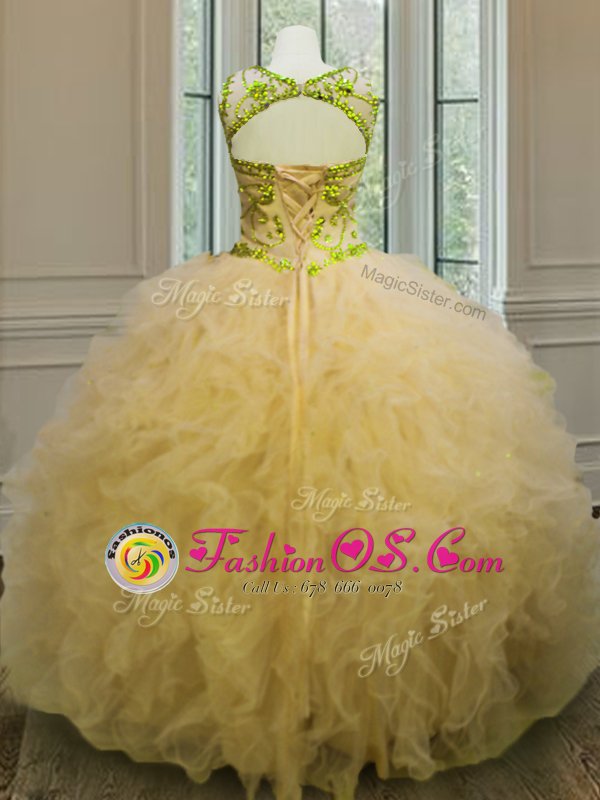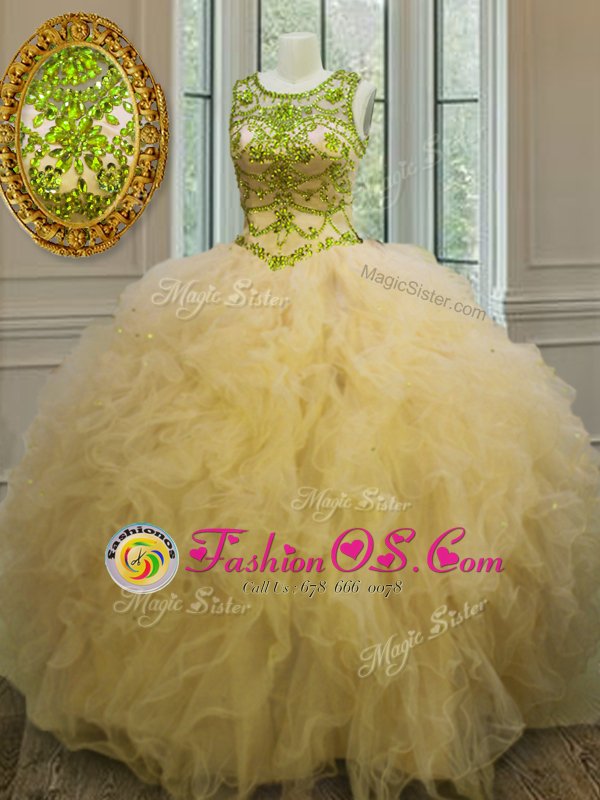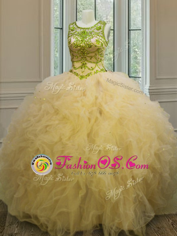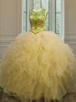 Home >  Quinceanera Dresses >  Fast Delivery Quinceanera Dresses > Light Yellow Tulle Lace Up Scoop Sleeveless Floor Length Quinceanera Dresses Beading and Ruffles