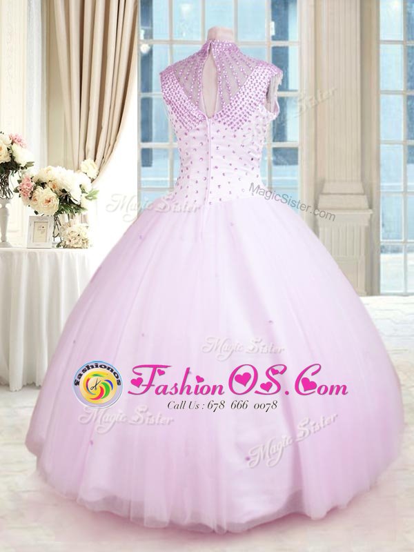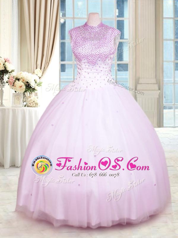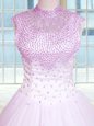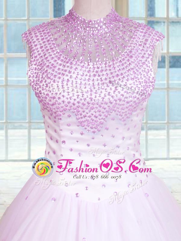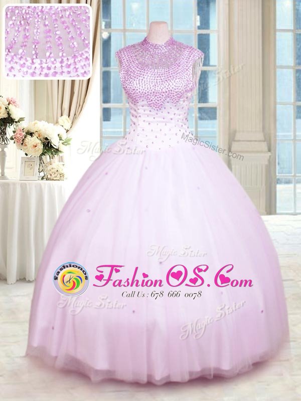 Lilac Ball Gowns High-neck Sleeveless Tulle Floor Length Zipper Beading Quinceanera Dress