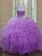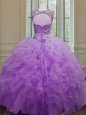 Lilac Ball Gowns Scoop Sleeveless Organza Floor Length Lace Up Beading and Ruffles Quince Ball Gowns