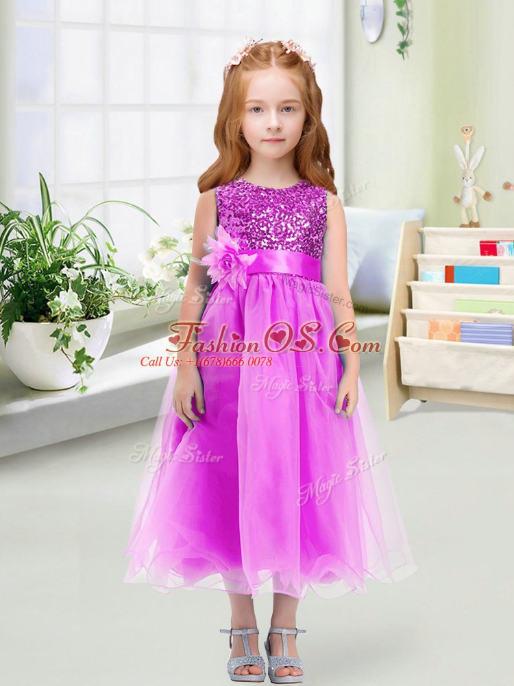 Lilac Scoop Neckline Sequins and Hand Made Flower Toddler Flower Girl Dress Sleeveless Zipper