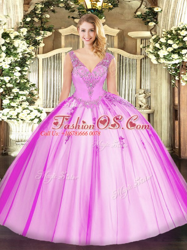 Lilac Tulle Lace Up Vestidos de Quinceanera Sleeveless Floor Length Beading