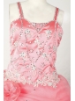 This little girl birthday dress is a perfect style. With sparkle beading on the bodice and the 2 thick straps,some special pink flowers on the hen part which make the dress look very fashionable!