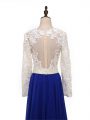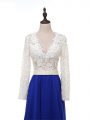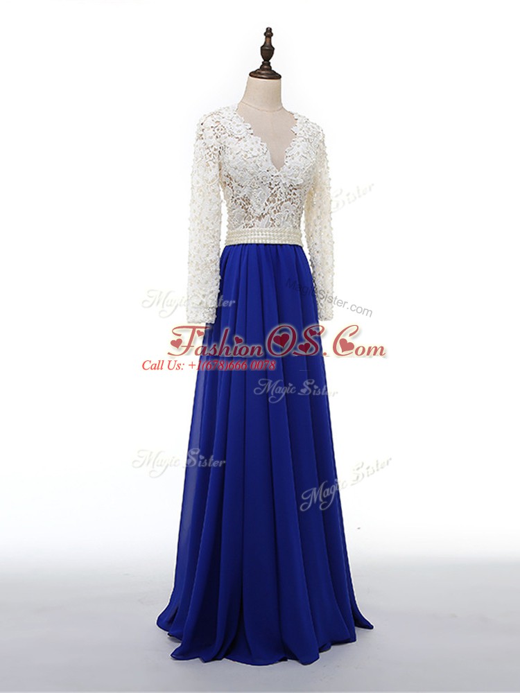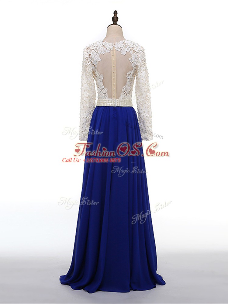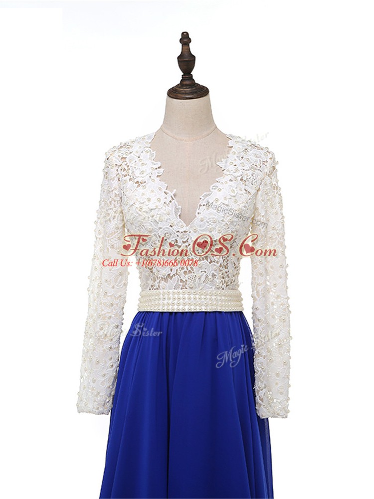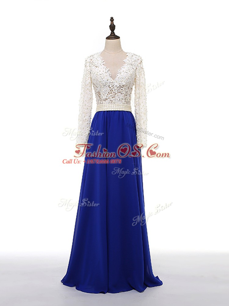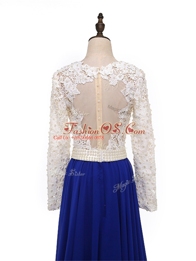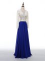 Long Sleeves Chiffon Floor Length Zipper Mother Of The Bride Dress in Blue And White with Lace and Appliques