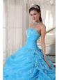 This aqua quinceanera dress is with a strapless bodice, which adorned by delicate appliques with beadings fully around the edge part. It features a crossing riched tulle layer at the waist part which contours your curve.The pick ups adorned by the same appliques at the hips of one side above the flowing bottom adds details to the middle skirt.