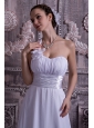 Elegant yet notable. The wedding gown features a one-shoulder sweetheart neckline and a A-line floor-length skirt. The wide ruched strap secure the dress in place. And a crosswise ruched band decorates the waist and represents your slim line. The ruched bodice adds the nicely look. The fllower on the bust will surely be the lightspot. Also the back is designed with lace up to make the dress easy off and on. This soft and gorgeous dress will be the choice for countless women for wedding or other formal occasion.