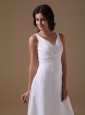 This elegant wedding dress is crafted in luxurious chiffon, features a straps V-neck. A ruched band decorated with some clear beadings defines the waist and some loose ruching on the bust accented the sexy design. A glamous deep V-shape zipper-up back ensures a perfect fit. Featured with A-line sweep train and light materials chiffon and lustrous charmeuse, this beach wedding dress is the right choice for brides who want to enjoy a fantastic golden beach ceremony.