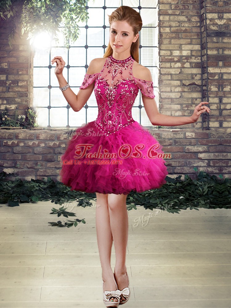 Home >  Prom Dresses >  Prom Dresses 2018 > Lovely Fuchsia A-line Beading and Ruffles Evening Dress Lace Up Tulle Sleeveless Mini Length