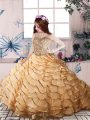 Lovely Gold Kids Pageant Dress Party and Sweet 16 and Wedding Party with Beading and Ruffled Layers Straps Sleeveless Court Train Lace Up