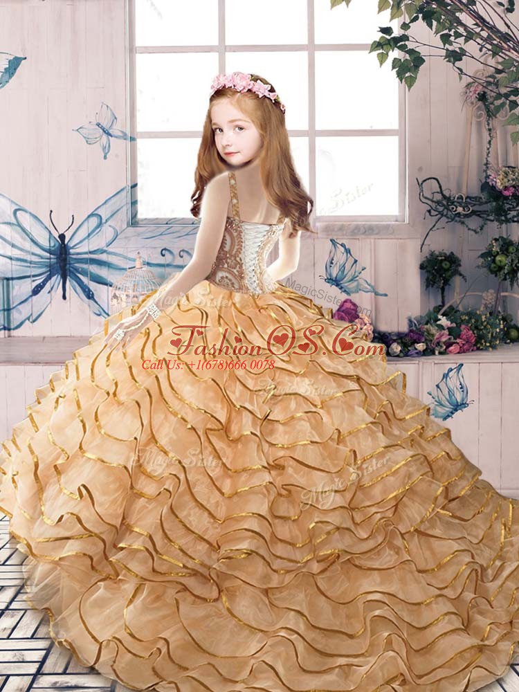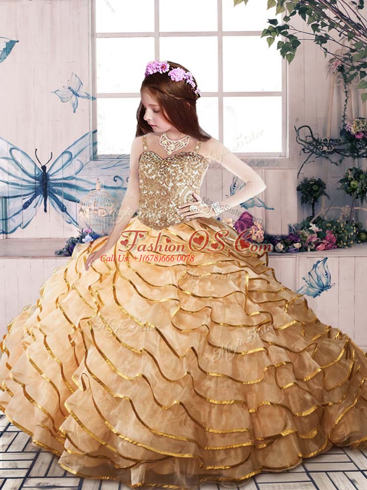 Home >  Special Occasion Dresses >  2019 Little Girl Pageant Dresses > Lovely Gold Kids Pageant Dress Party and Sweet 16 and Wedding Party with Beading and Ruffled Layers Straps Sleeveless Court Train Lace Up