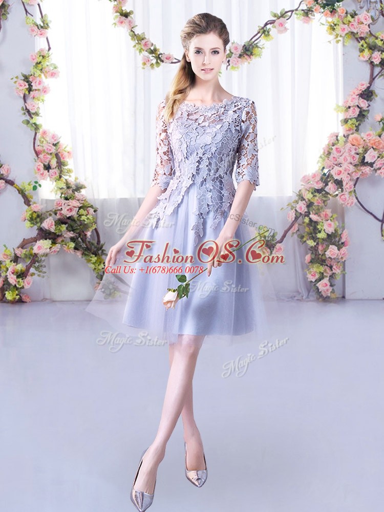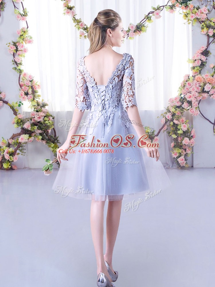 Lovely Grey Tulle Lace Up High-neck Half Sleeves Mini Length Bridesmaid Dresses Lace