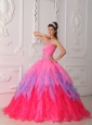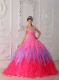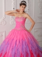 This elegant and flowing quinceanera dress features a beaded sweetheart neckline bust and a ruched bodice. Encrusted with beadings at the waist, which adds more details in the middle section. Vertical layers of ruffels with different colors transited makes the gown stand out.