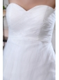 Wow the crowd with this breathtaking wedding dress! The close-fitting bodice is encrusted by a sexy sweetheart neckline intricate ruchings on the waist. A soft layer of tulle envelopes the whole dress and extends to the fairytale mermaid style skirt to form a romantic chapel train in the back. A hidden zipper makes for easy off and on and secures the dress in place.